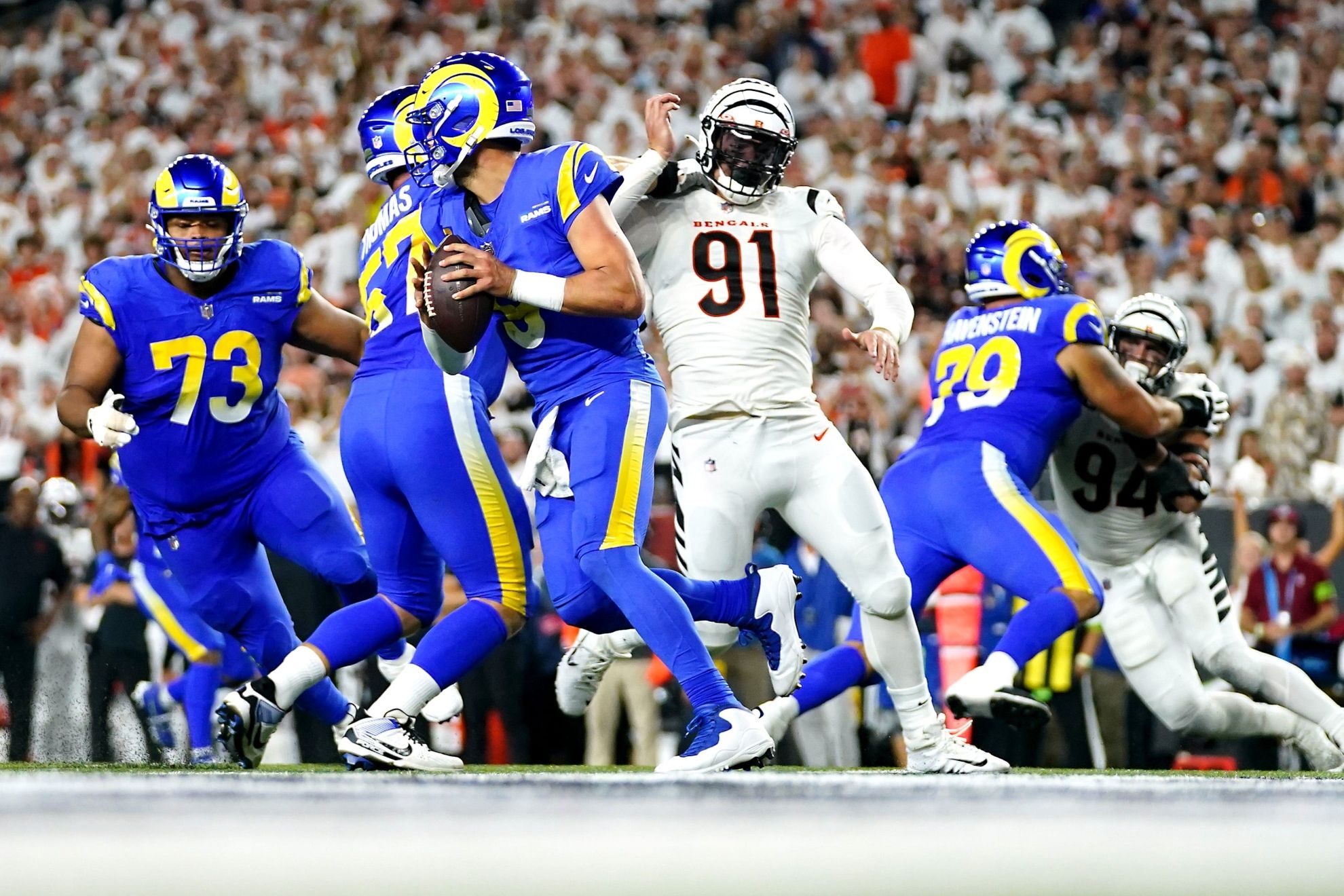 Cincinnati Bengals defensive end Trey Hendrickson (91) pressures Los Angeles Rams quarterback Matthew Stafford (9) in the fourth quarter during a Week 3 NFL football game between the Los Angeles Rams and the Cincinnati Bengals, Monday, Sept. 25, 2023, at Paycor Stadium in Cincinnati. The Cincinnati Bengals won, 19-16.