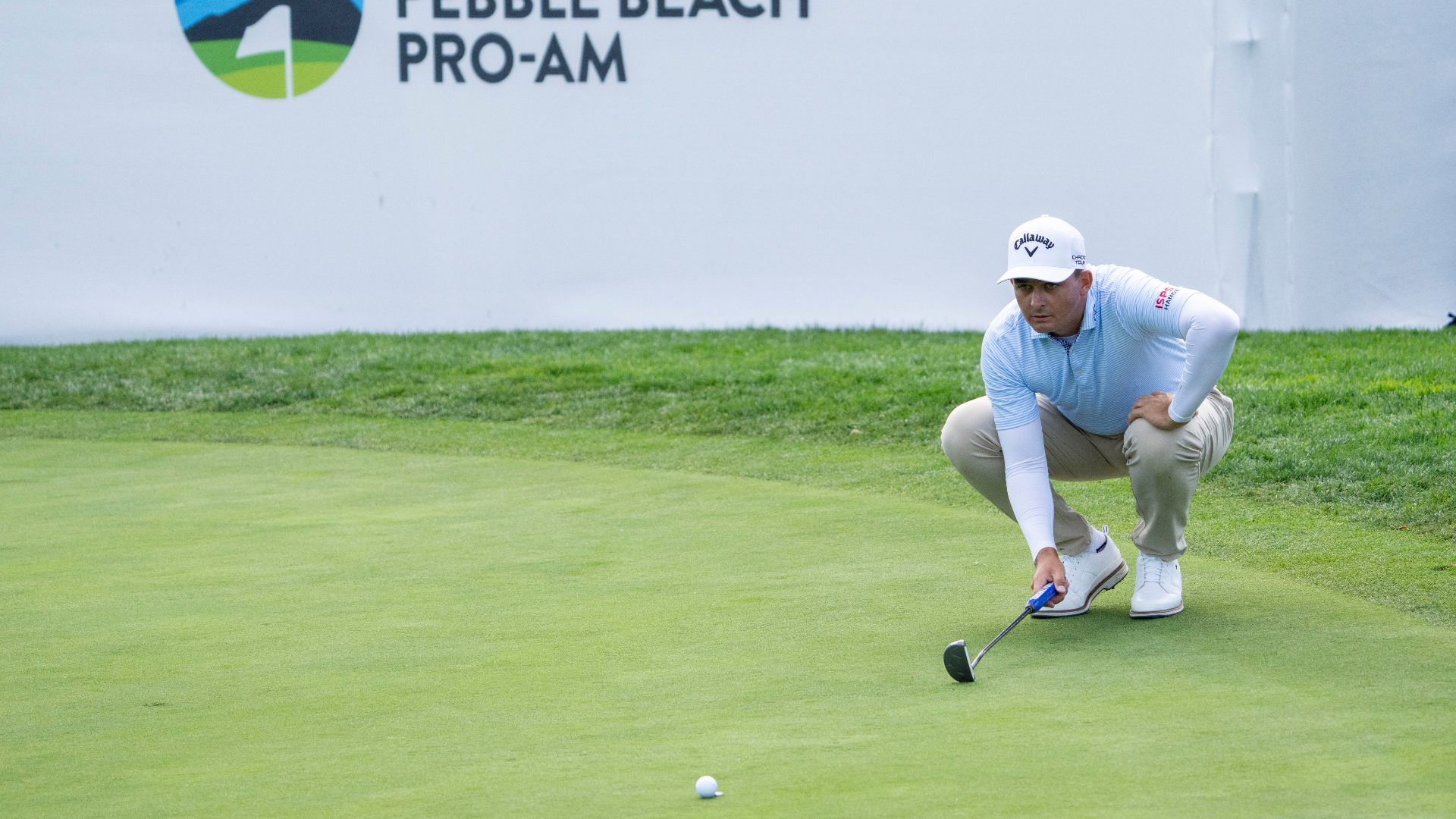 February 1, 2024; Pebble Beach, California, USA; Christiaan Bezuidenhout lines up his putt on the 16th hole during the first round of the AT&T Pebble Beach Pro-Am golf tournament at Pebble Beach Golf Links. Mandatory Credit: Kyle Terada-USA TODAY Sports