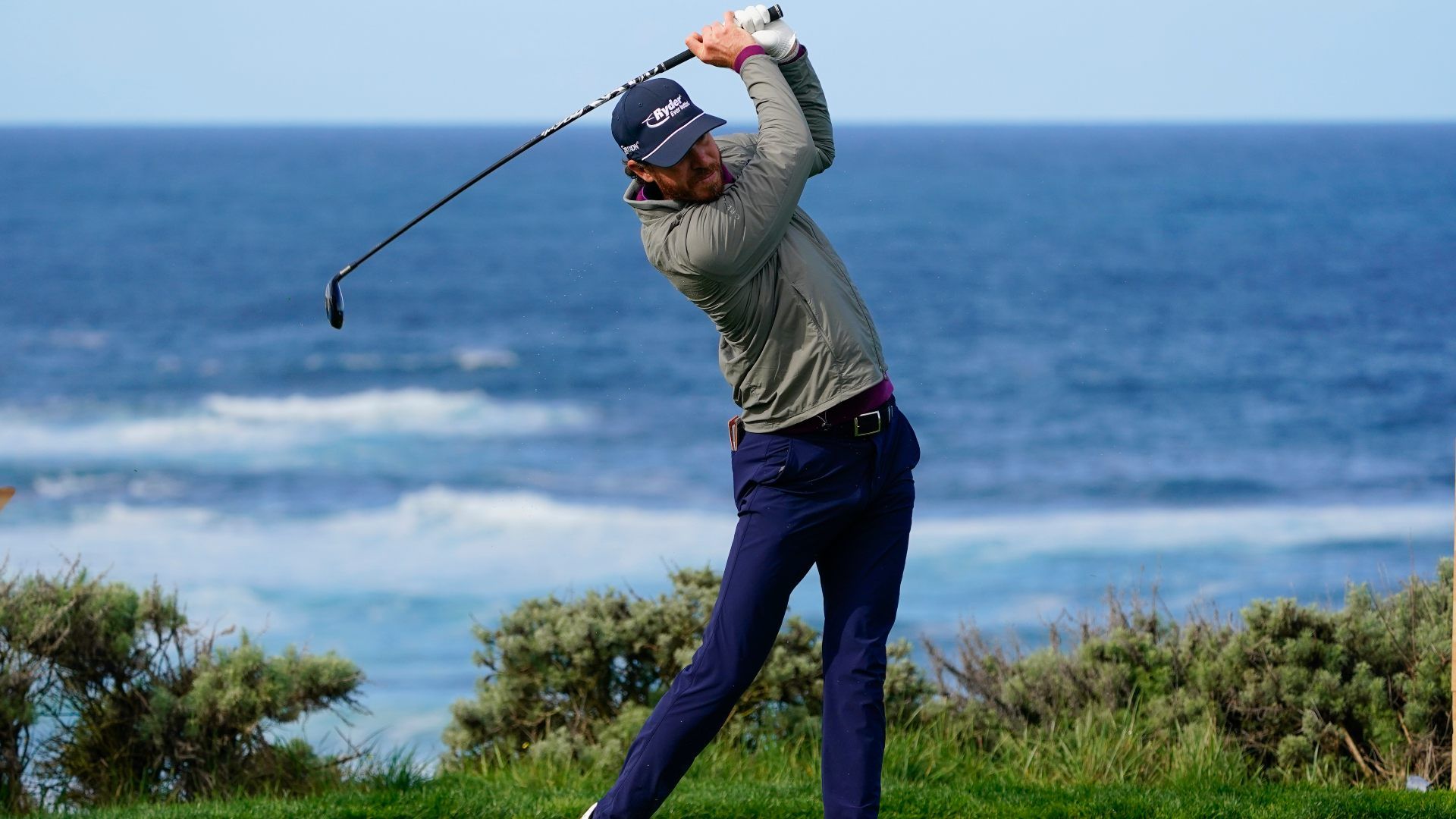 Feb 2, 2024; Pebble Beach, California, USA; Sam Ryder hits his tee shot on the 4th hole during the second round of the AT&T Pebble Beach Pro-Am golf tournament at Spyglass Hill Golf Course. Mandatory Credit: Michael Madrid-USA TODAY Sports