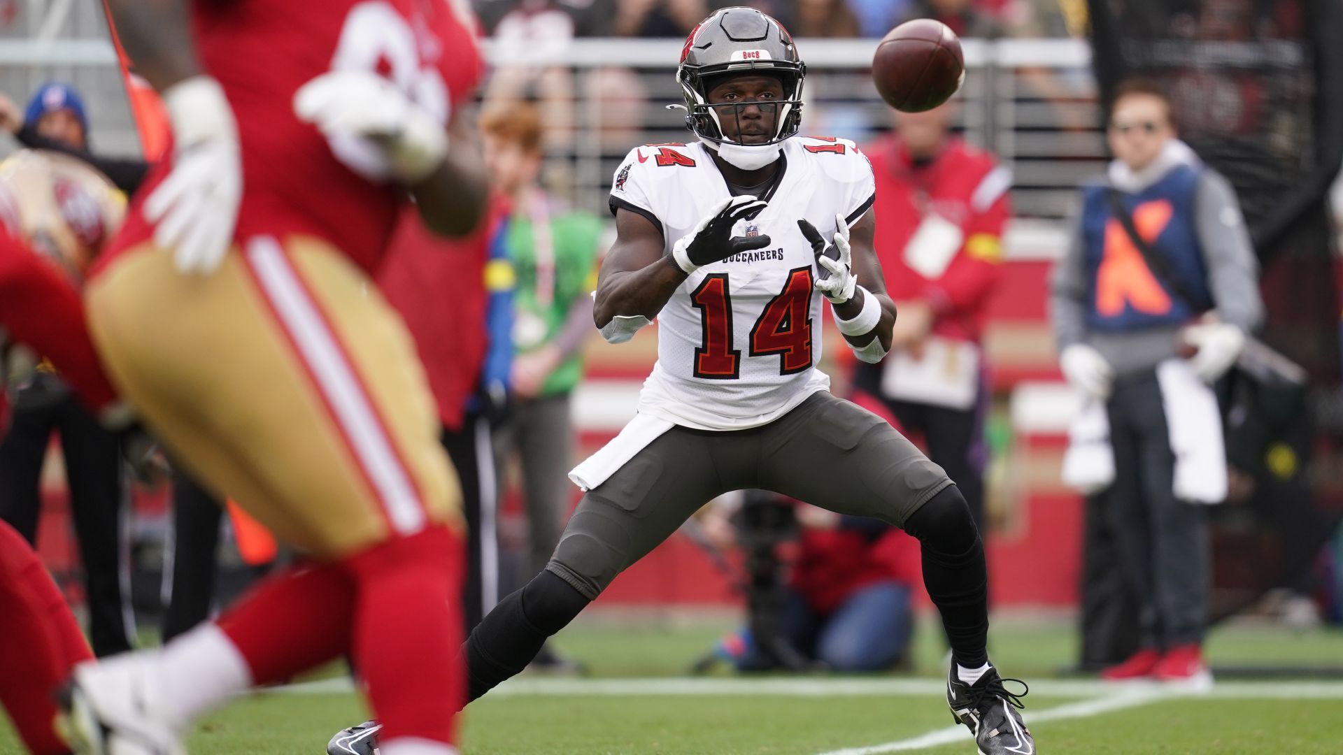 Dec 11, 2022; Santa Clara, California, USA; Tampa Bay Buccaneers wide receiver Chris Godwin (14) catches a pass against the San Francisco 49ers in the second quarter at Levi's Stadium. Mandatory Credit: Cary Edmondson-USA TODAY Sports