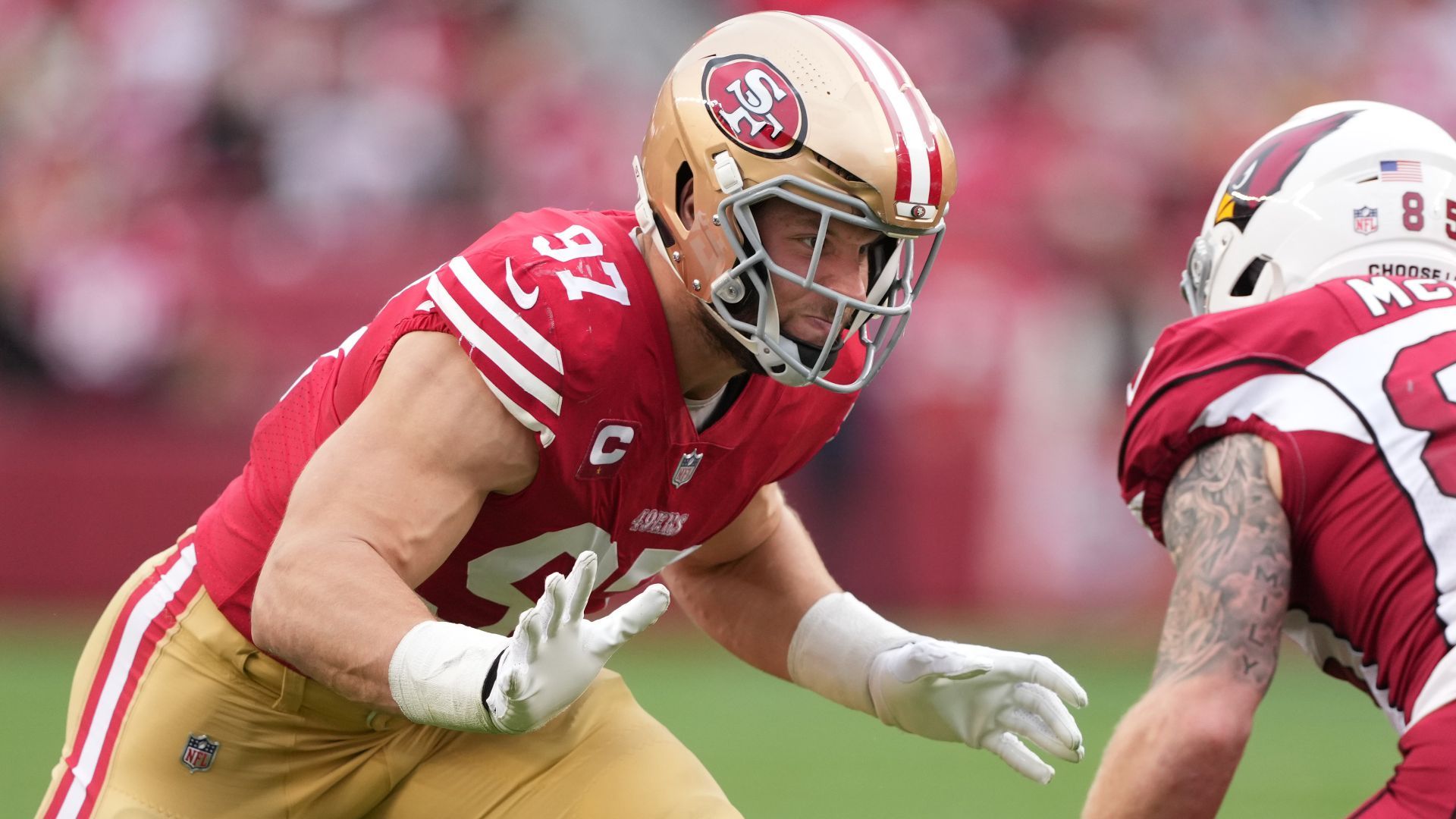 Jan 8, 2023; Santa Clara, California, USA; San Francisco 49ers defensive end Nick Bosa (97) rushes against Arizona Cardinals tight end Trey McBride (85) during the third quarter at Levi's Stadium. Mandatory Credit: Darren Yamashita-USA TODAY Sports