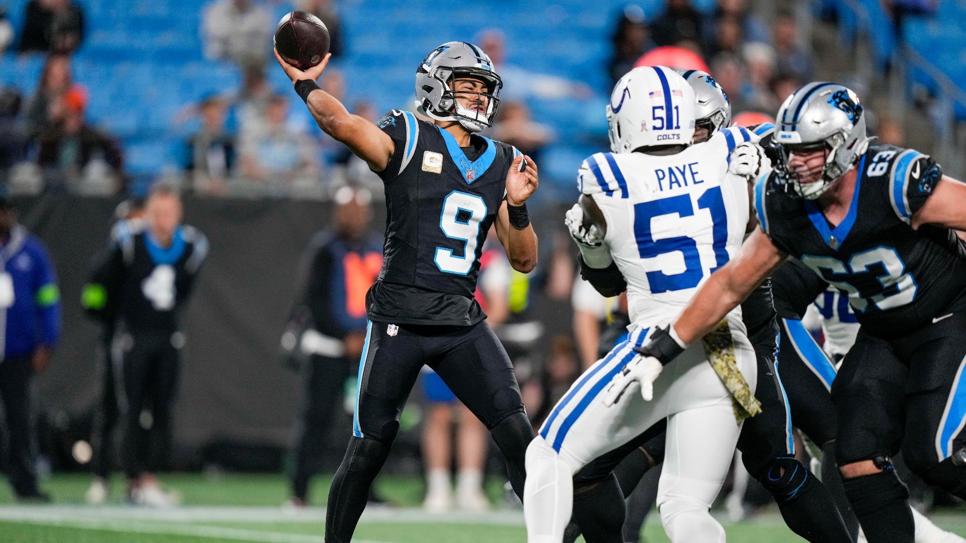Nov 5, 2023; Charlotte, North Carolina, USA; Carolina Panthers quarterback Bryce Young (9) throws the ball against the Indianapolis Colts during the second half at Bank of America Stadium. Mandatory Credit: Jim Dedmon-USA TODAY Sports