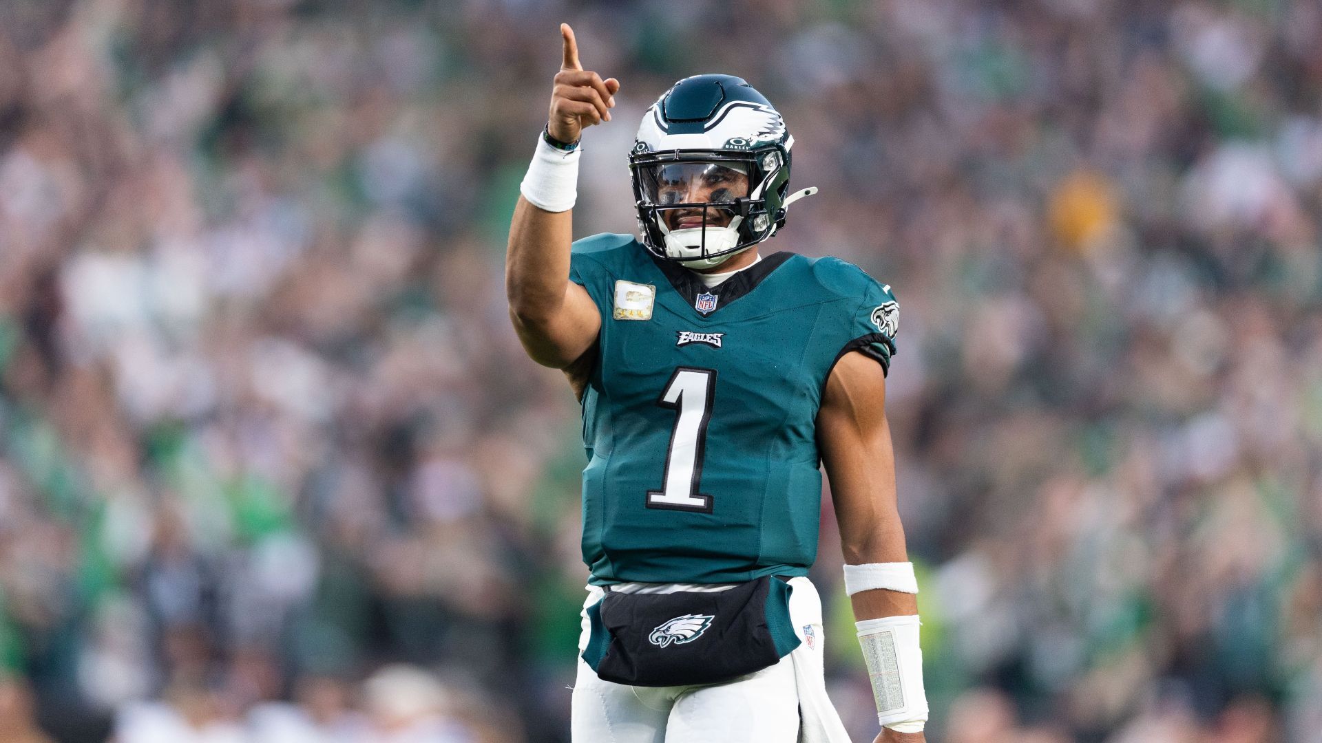 Nov 5, 2023; Philadelphia, Pennsylvania, USA; Philadelphia Eagles quarterback Jalen Hurts (1) reacts after a touchdown against the Dallas Cowboys during the first quarter at Lincoln Financial Field. Mandatory Credit: Bill Streicher-USA TODAY Sports