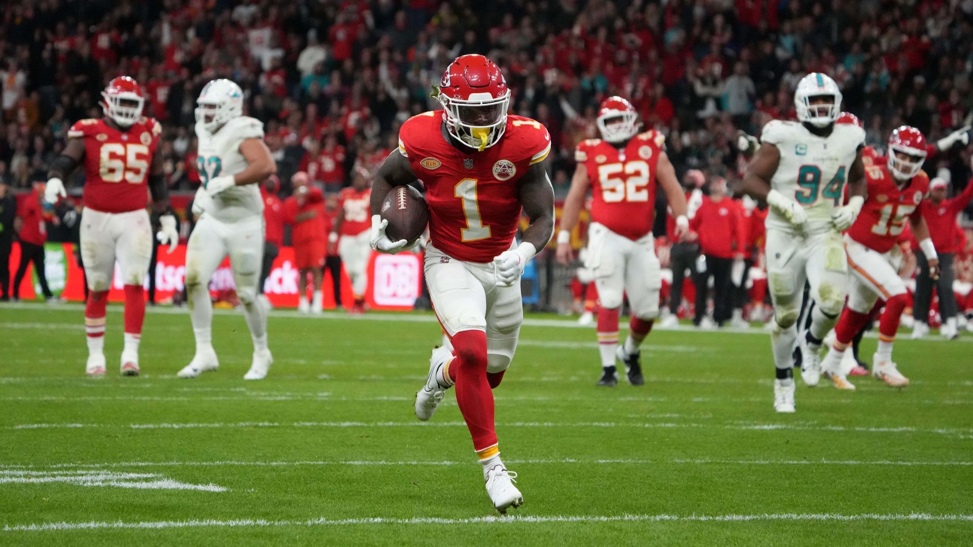Nov 5, 2023; Frankfurt, Germany; Kansas City Chiefs running back Jerick McKinnon (1) scores on a 17-yard touchdown reception against the Miami Dolphins in the first half during an NFL International Series game at Deutsche Bank Park. Mandatory Credit: Kirby Lee-USA TODAY Sports