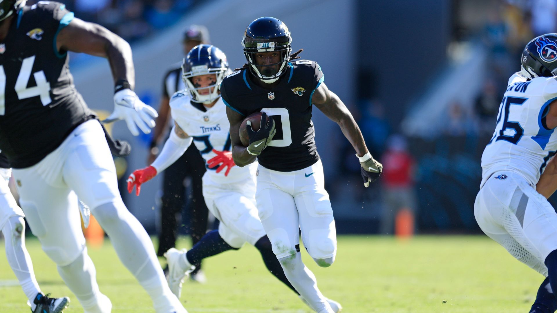 Jacksonville Jaguars wide receiver Calvin Ridley (0) rushes for yards during the second quarter an NFL football matchup Sunday, Nov. 19, 2023 at EverBank Stadium in Jacksonville, Fla. The Jacksonville Jaguars defeated the Tennessee Titans 34-14. [Corey Perrine/Florida Times-Union]