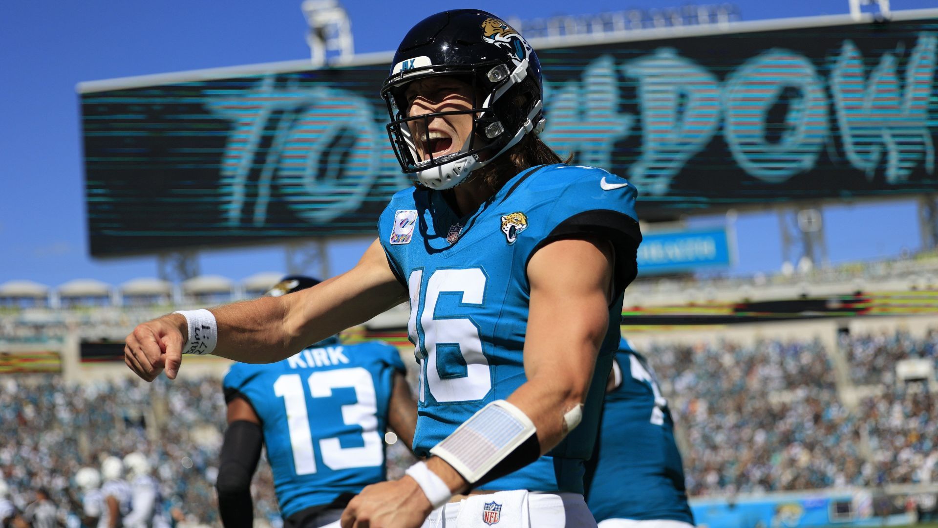 Jacksonville Jaguars quarterback Trevor Lawrence (16) celebrates the third touchdown for the Jaguars during the second quarter of an NFL football matchup Sunday, Oct. 15, 2023 at EverBank Stadium in Jacksonville, Fla.