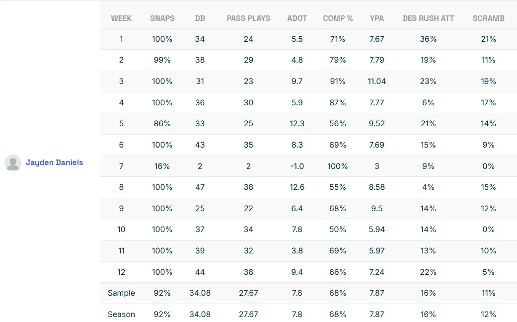 As I mentioned last week, Daniels is the cream of the crop in terms of explosiveness at his position. He had a 28.5% explosive run play rate in college and already has multiple rushes of over 30 yards on the season.