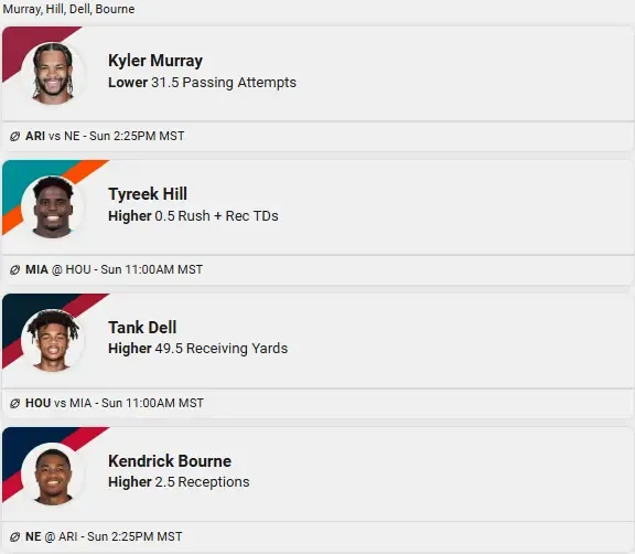 The 31.5 lower on Murray paired with the higher on receptions for Kendrick Bourne, who has been a good possession receiver for Drake Maye, makes sense from a correlation perspective.