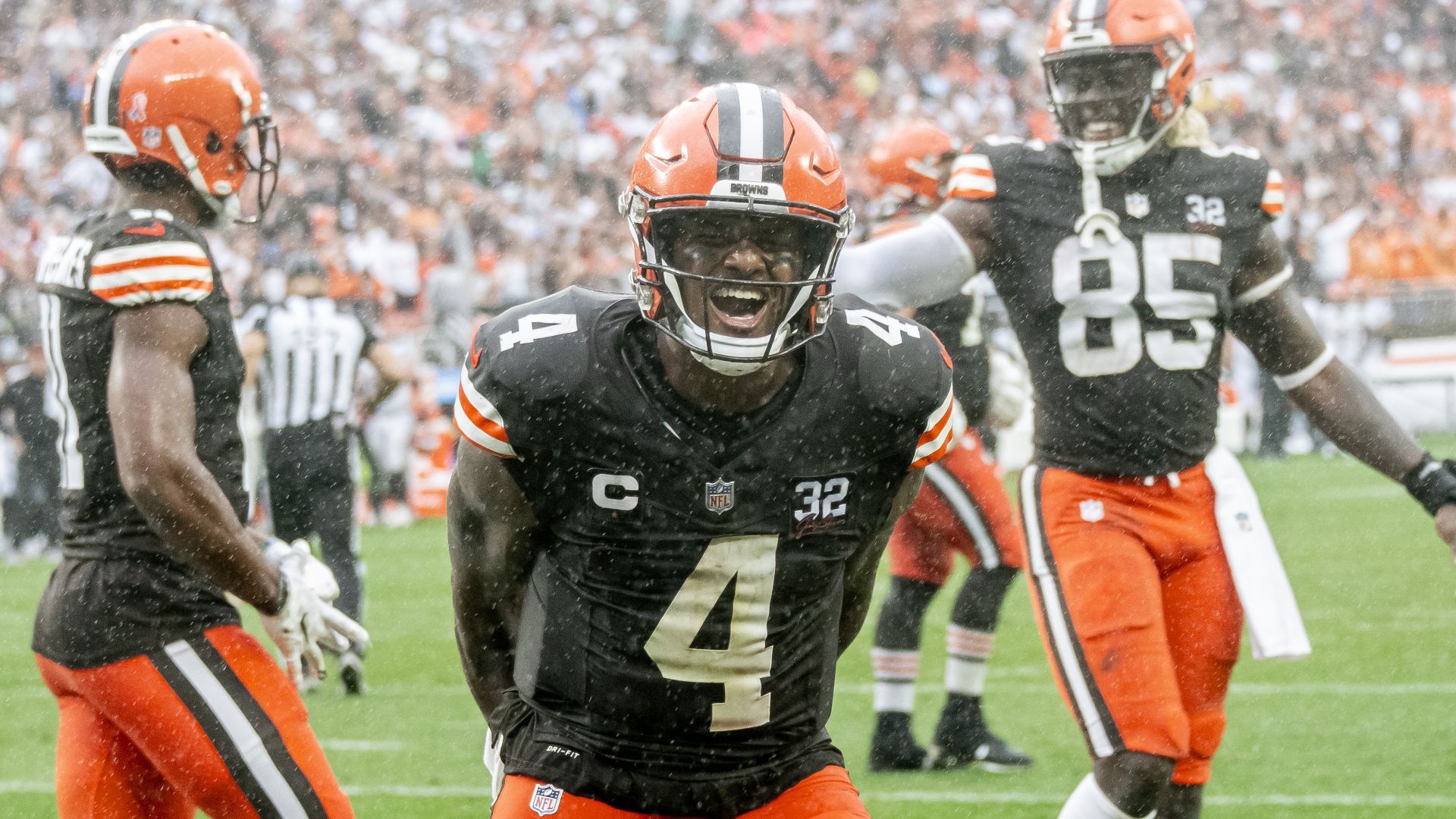 Sep 10, 2023; Cleveland, Ohio, USA; Cleveland Browns quarterback Deshaun Watson (4) celebrates after scoring a two point conversion during the second half against the Cincinnati Bengals at Cleveland Browns Stadium. Mandatory Credit: Ken Blaze-USA TODAY Sports