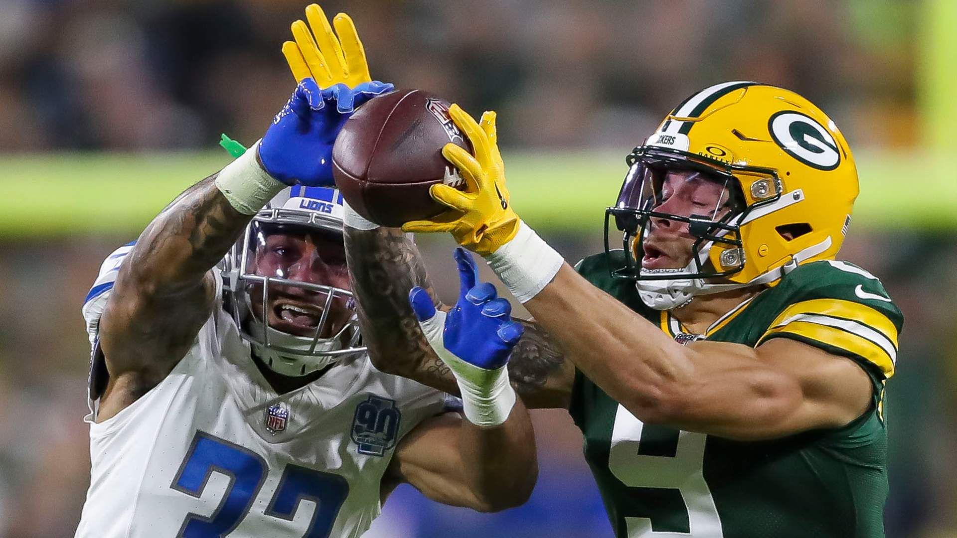 Sep 28, 2023; Green Bay, Wisconsin, USA; Detroit Lions safety Brian Branch (32) breaks up a pass intended for Green Bay Packers wide receiver Christian Watson (9) during their football game on Thursday, September 28, 2023, at Lambeau Field in Green Bay, Wis. Mandatory Credit: Tork Mason-USA TODAY Sports