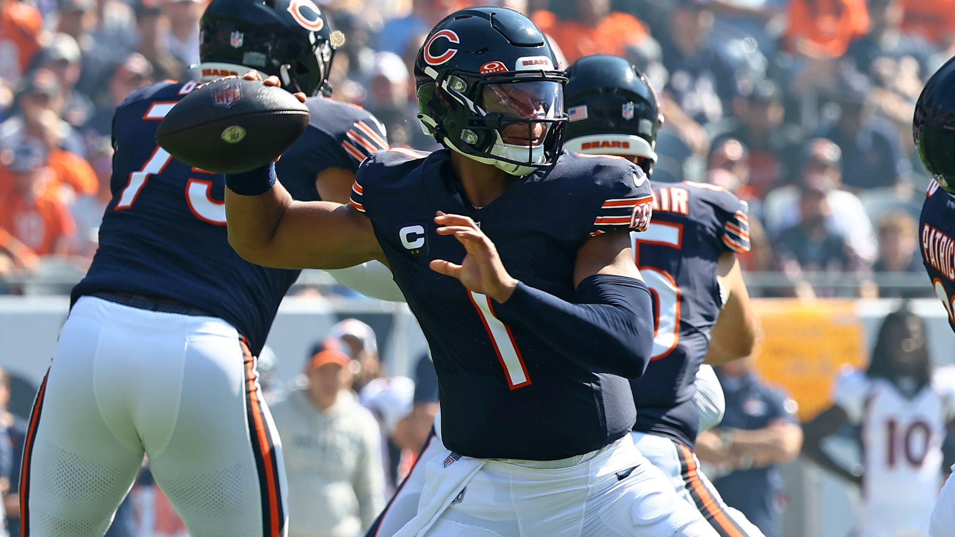 Oct 1, 2023; Chicago, Illinois, USA; Chicago Bears quarterback Justin Fields (1) drops back to pass/ against the Denver Broncos during the first half at Soldier Field. Mandatory Credit: Mike Dinovo-USA TODAY Sports