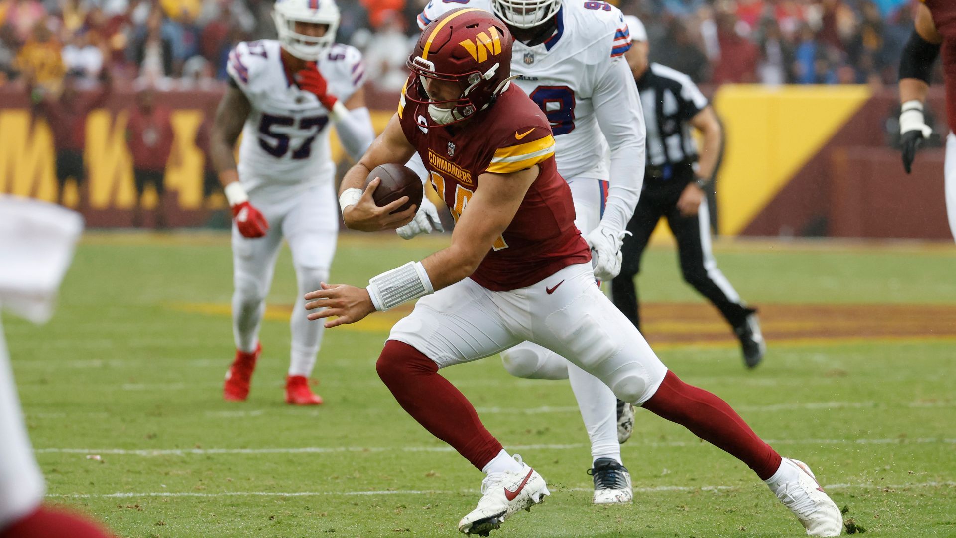Sep 24, 2023; Landover, Maryland, USA; Washington Commanders quarterback Sam Howell (14) runs with the ball as Buffalo Bills defensive tackle Tim Settle (99) chases during the second quarter at FedExField. Mandatory Credit: Geoff Burke-USA TODAY Sports