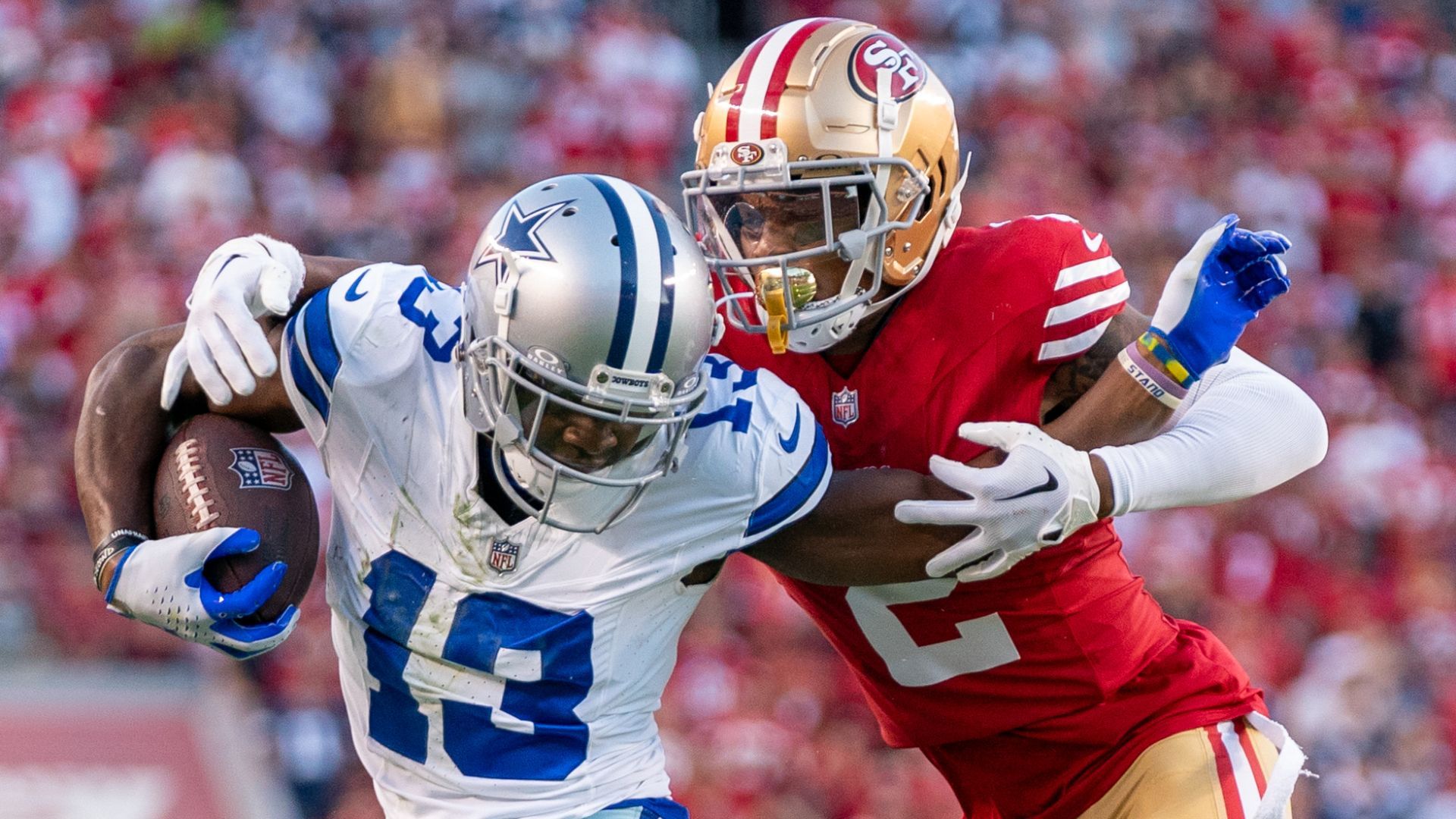 October 8, 2023; Santa Clara, California, USA; Dallas Cowboys wide receiver Michael Gallup (13) is tackled by San Francisco 49ers cornerback Deommodore Lenoir (2) during the second quarter at Levi's Stadium. Mandatory Credit: Kyle Terada-USA TODAY Sports