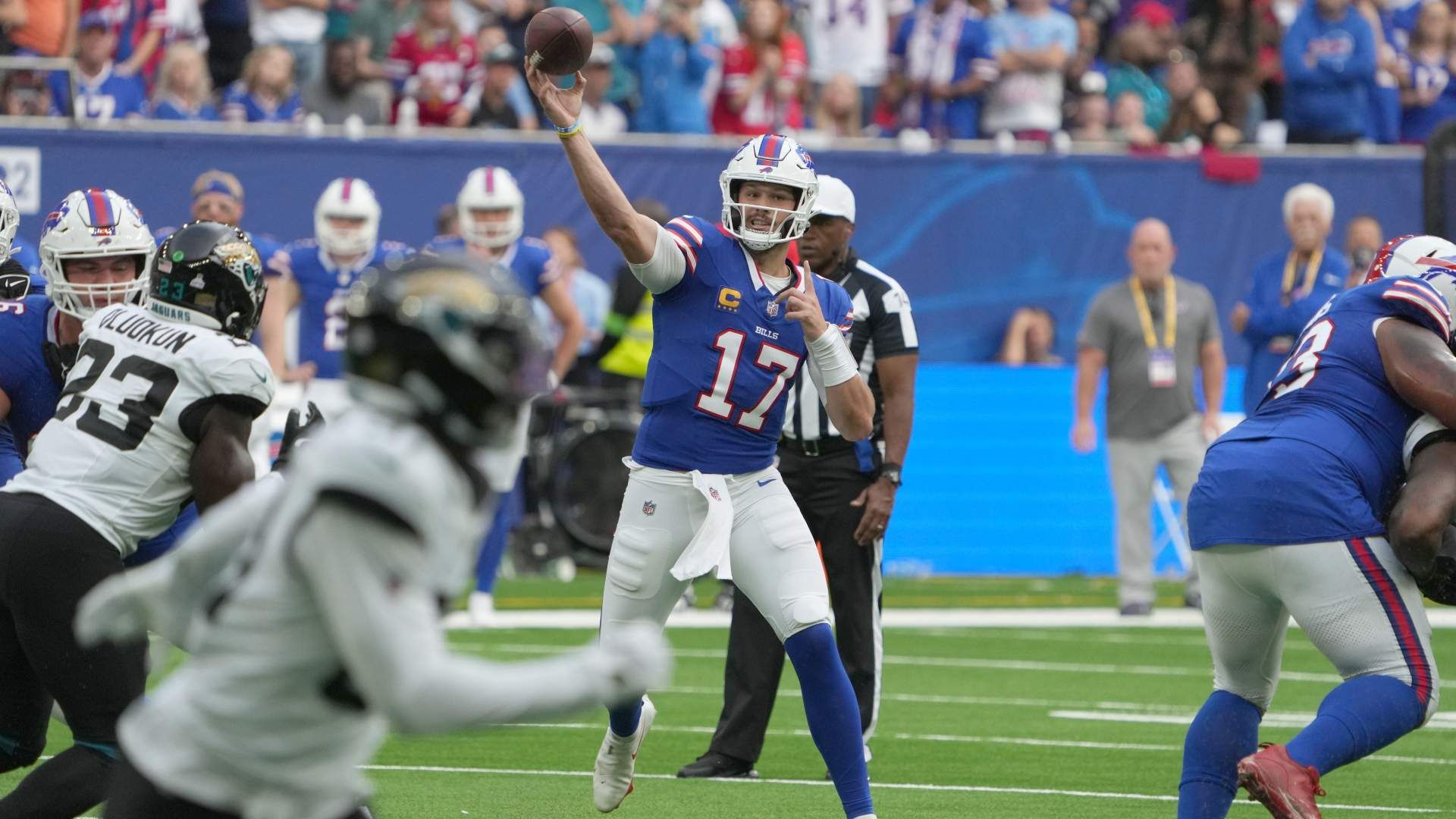 Oct 8, 2023; London United Kingdom, Buffalo Bills quarterback Josh Allen (17) throws the ball against the Jacksonville Jaguars during the first half of an NFL International Series game at Tottenham Hotspur Stadium. Mandatory Credit: Kirby Lee-USA TODAY Sports