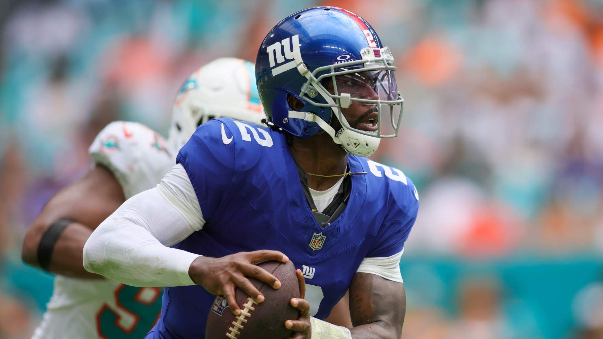 Oct 8, 2023; Miami Gardens, Florida, USA; New York Giants quarterback Tyrod Taylor (2) runs with the football against the Miami Dolphins during the fourth quarter at Hard Rock Stadium. Mandatory Credit: Sam Navarro-USA TODAY Sports