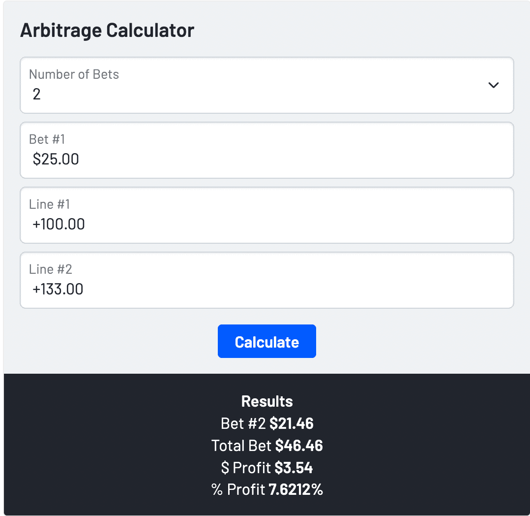To calculate the proper betting amounts, you can use an arbitrage calculator. You could just bet $25 on Alabama, but if Georgia wins, you’re not going to make any money. Using an arbitrage calculator will tell you exactly how much you should bet on Alabama if you want to lock in the same win regardless of who wins (in this case, $21.46):