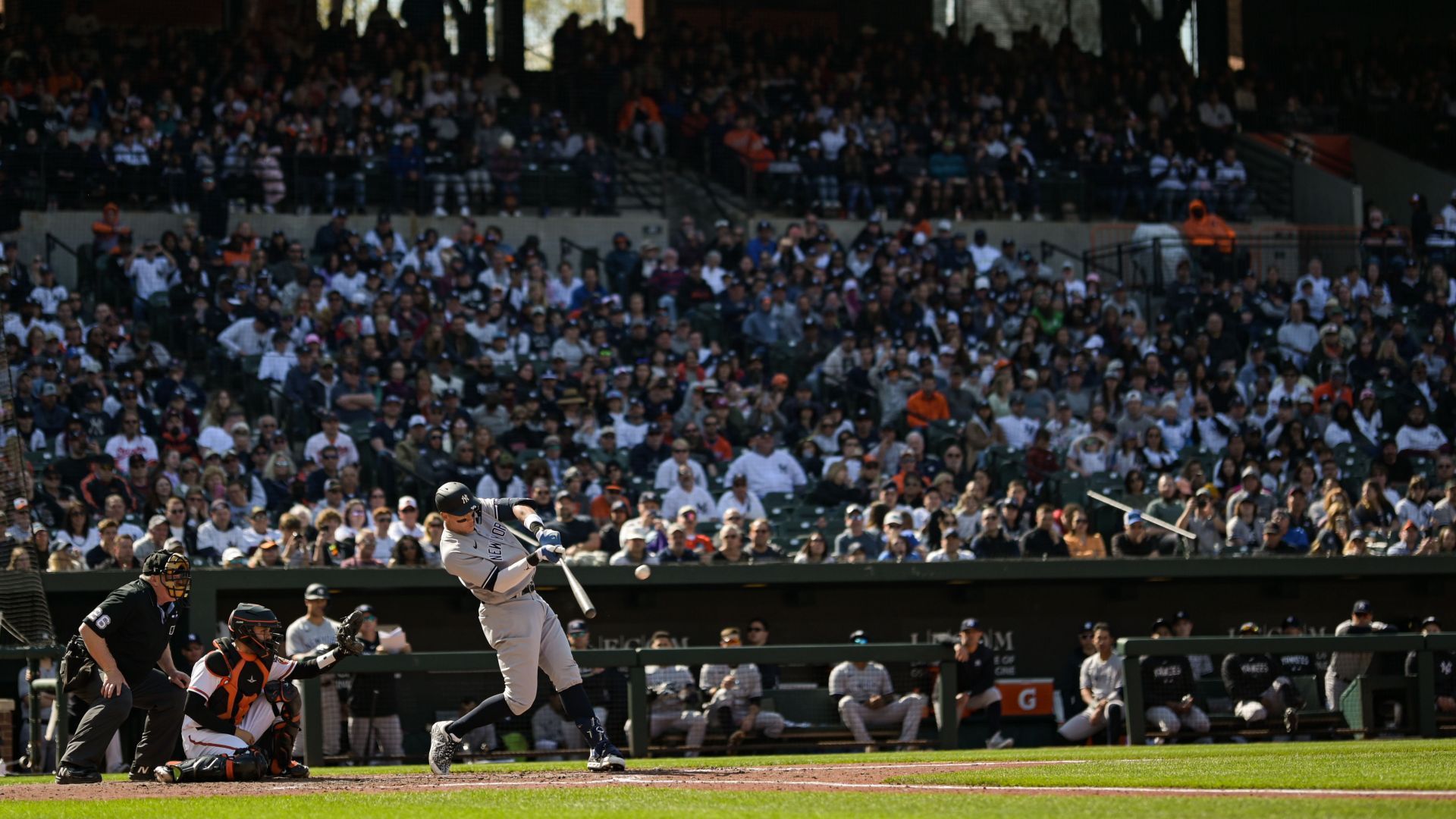 Apr 8, 2023; Baltimore, Maryland, USA; New York Yankees right fielder Aaron Judge (99) hits a solo home run in the eighth inning against the Baltimore Orioles at Oriole Park at Camden Yards. Mandatory Credit: Tommy Gilligan-USA TODAY Sports