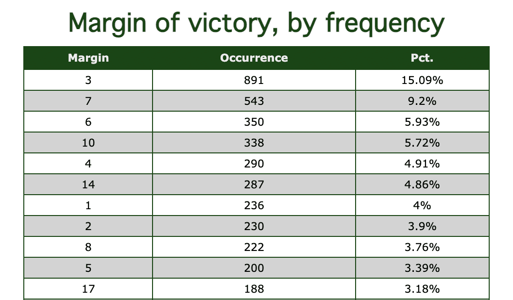 As a result, the vast majority of NFL games are decided by specific numbers: three, seven, six, 10, and four are the most common margins (in that order). 3.0 is the most common margin by a wide volume, with more than 15% of games ending on that number from 2000-2022 (via Cleanup Hitter):