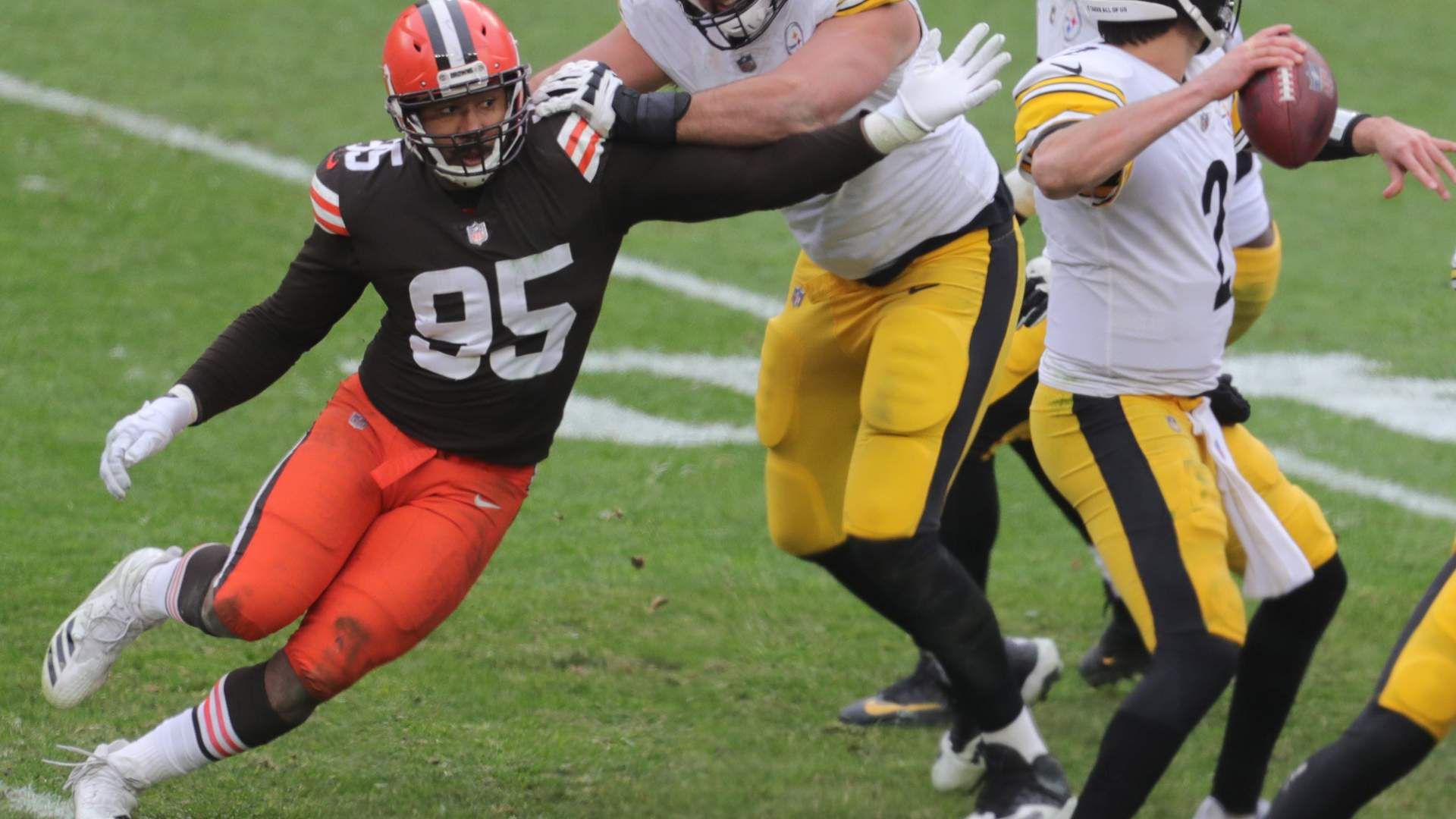 Cleveland Browns' Myles Garrett pressures Pittsburgh Steelers quarterback Mason Rudolph during a third quarter pass play on Sunday, Jan. 3, 2020 in Cleveland, Ohio, at FirstEnergy Stadium. The Browns won the game 24-22. Photo Credit: PHIL MASTURZO / USA TODAY NETWORK