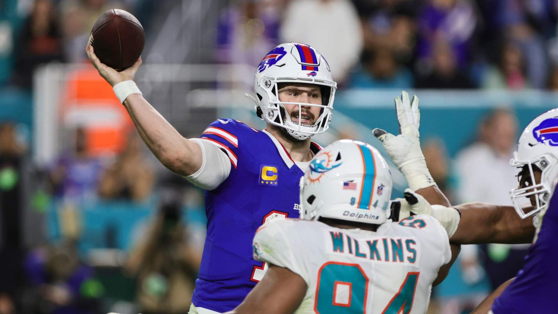Jan 7, 2024; Miami Gardens, Florida, USA; Buffalo Bills quarterback Josh Allen (17) throws the football against the Miami Dolphins during the fourth quarter at Hard Rock Stadium. Mandatory Credit: Sam Navarro-USA TODAY Sports
