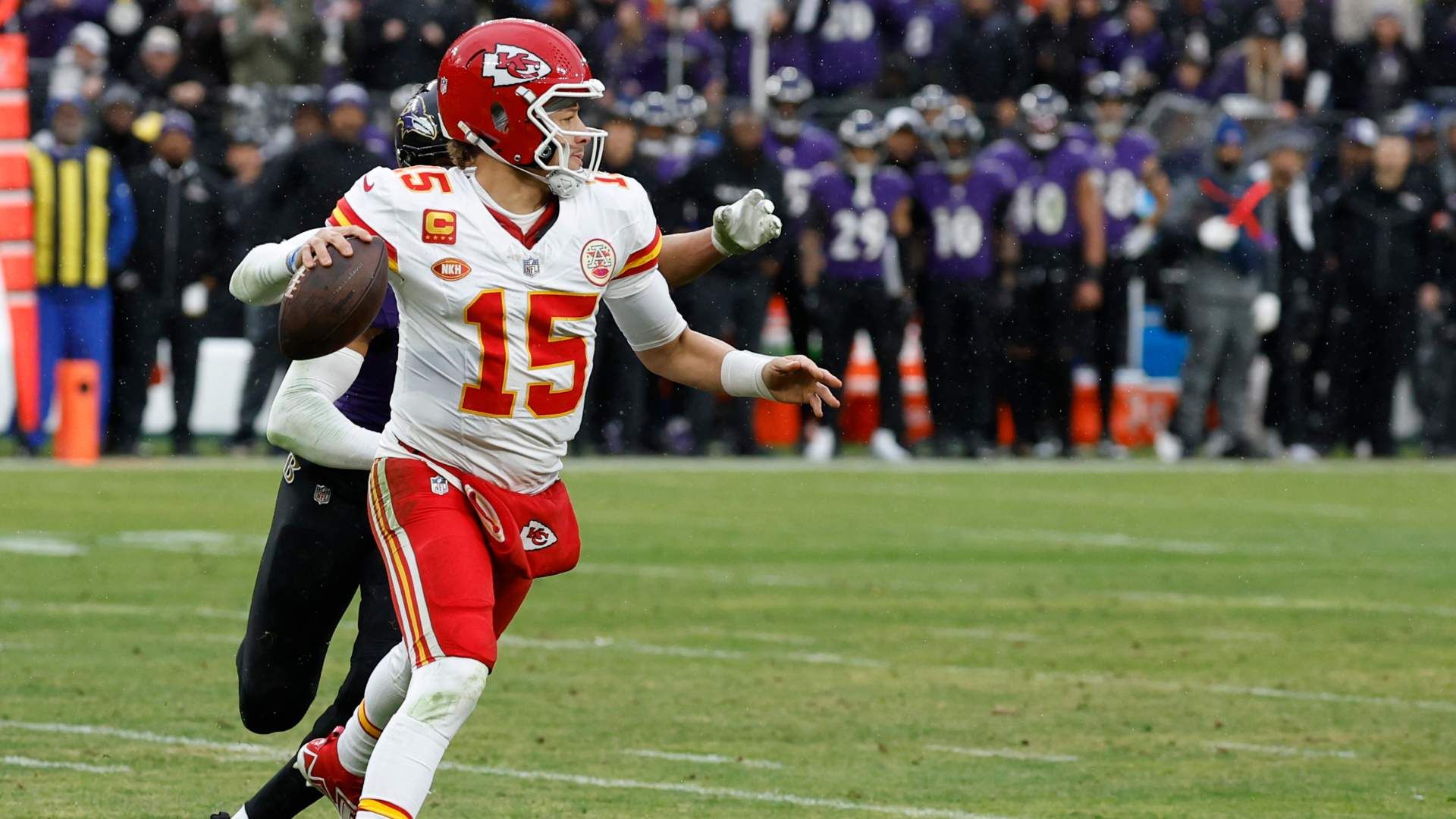 Jan 28, 2024; Baltimore, Maryland, USA; Kansas City Chiefs quarterback Patrick Mahomes (15) passes the ball against the Baltimore Ravens in the AFC Championship football game at M&T Bank Stadium. Mandatory Credit: Geoff Burke-USA TODAY Sports