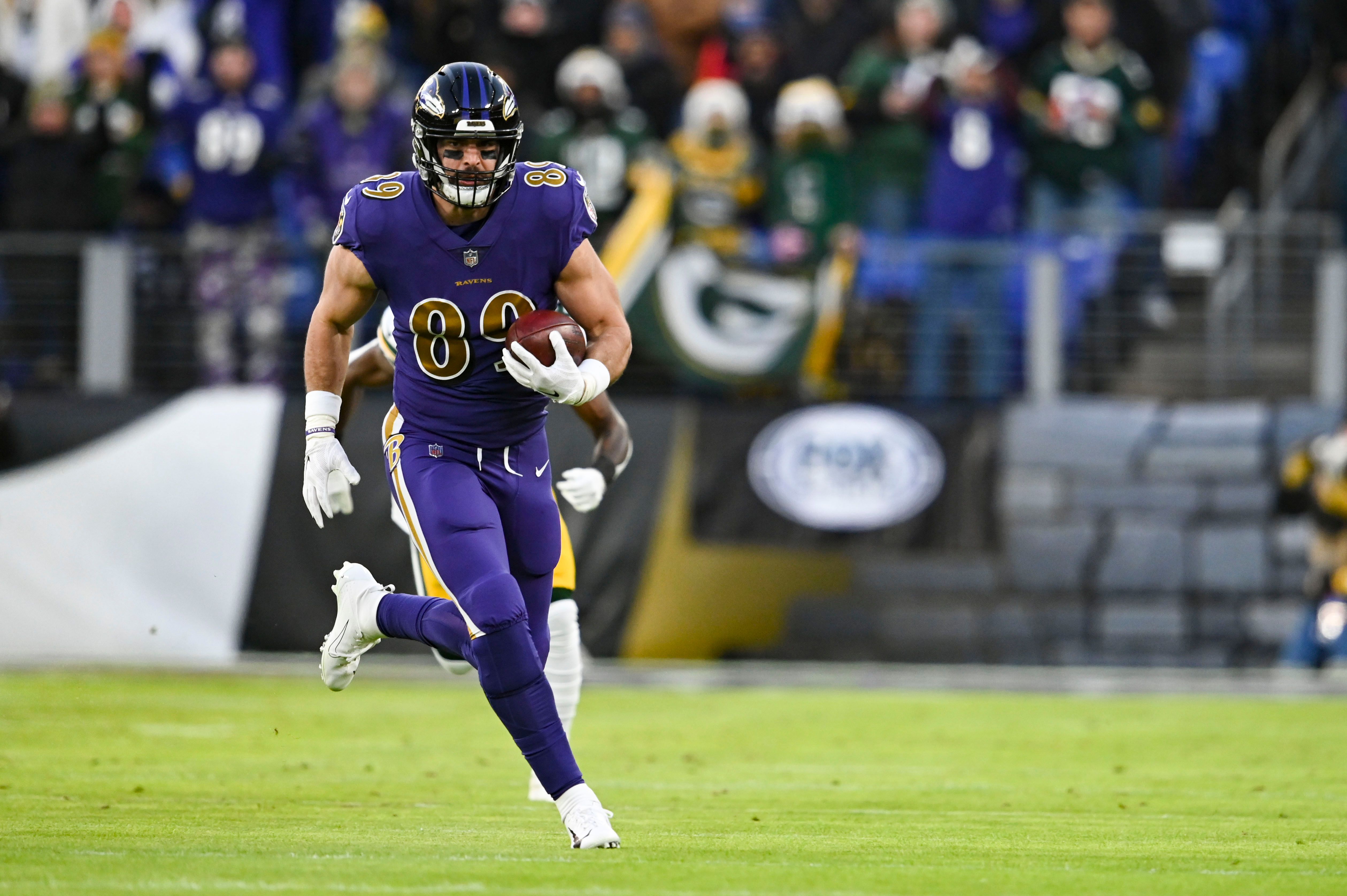 Dec 19, 2021; Baltimore, Maryland, USA; Baltimore Ravens tight end Mark Andrews (89) runs after the catch during the first half against the Green Bay Packers dat M&T Bank Stadium. Mandatory Credit: Tommy Gilligan-USA TODAY Sports