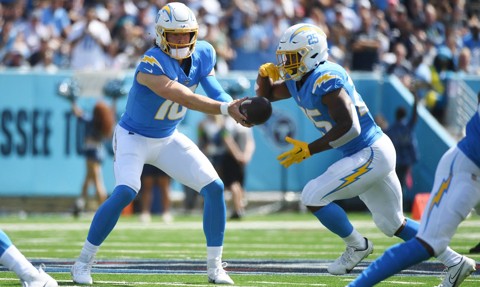 Sep 17, 2023; Nashville, Tennessee, USA; Los Angeles Chargers quarterback Justin Herbert (10) hands the ball off to running back Joshua Kelley (25) during the first half against the Tennessee Titans at Nissan Stadium. Mandatory Credit: Christopher Hanewinckel-USA TODAY Sports