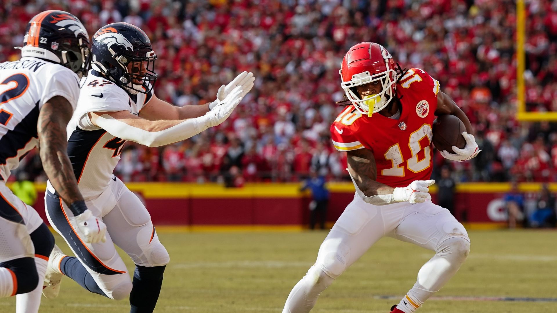 Jan 1, 2023; Kansas City, Missouri, USA; Kansas City Chiefs running back Isiah Pacheco (10) runs the ball against Denver Broncos linebacker Josey Jewell (47) and safety Kareem Jackson (22) during the second half at GEHA Field at Arrowhead Stadium. Mandatory Credit: Jay Biggerstaff-USA TODAY Sports