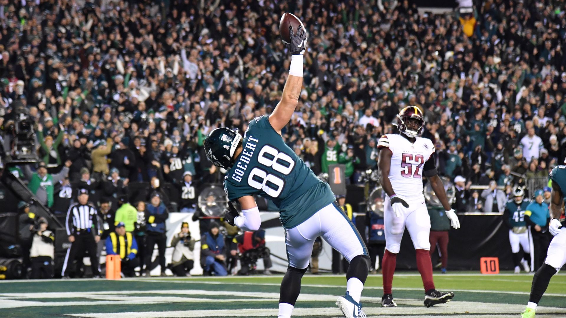 Nov 14, 2022; Philadelphia, Pennsylvania, USA; Philadelphia Eagles tight end Dallas Goedert (88) spikes the football after making a touchdown catch against the Washington Commanders during the first quarter at Lincoln Financial Field. Mandatory Credit: Eric Hartline-USA TODAY Sports