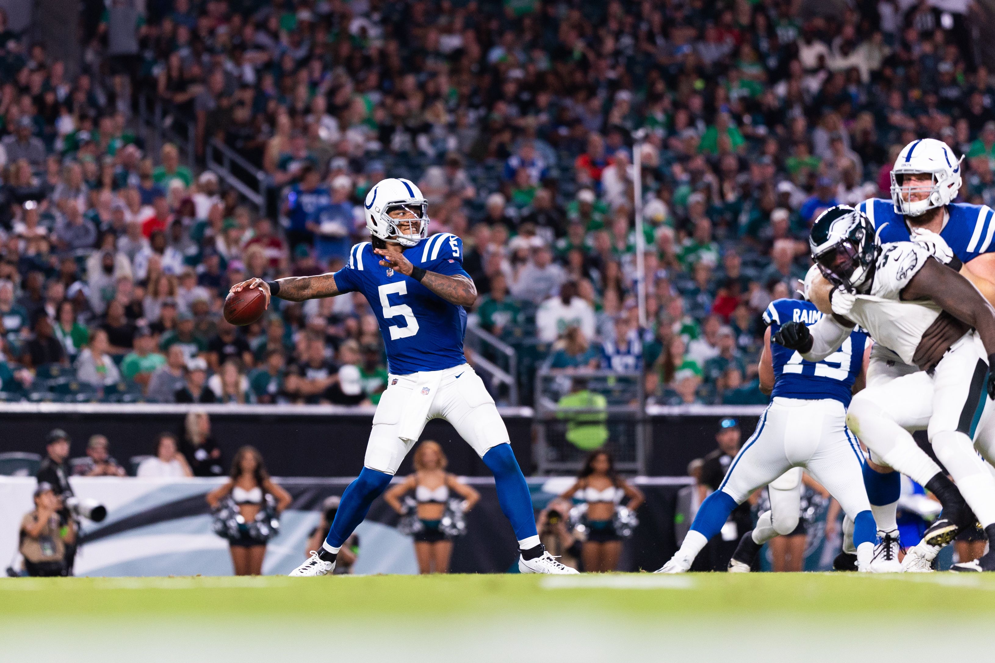 Aug 24, 2023; Philadelphia, Pennsylvania, USA; Indianapolis Colts quarterback Anthony Richardson (5) in action against the Philadelphia Eagles at Lincoln Financial Field. Mandatory Credit: Bill Streicher-USA TODAY Sports