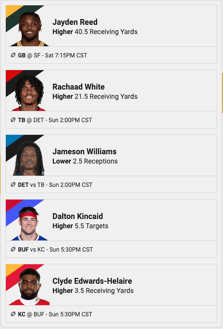 While you could look at the HIGHERS on his yards or reception totals in this spot, with WR Gabriel Davis still not practicing as of Thursday, I like going over on this strictly target prop instead. It takes the weather out of play somewhat (as we don’t need him to catch the ball) and also stands out in our projections which have Kincaid much closer to 6.0 targets (than 5.0) in this game.