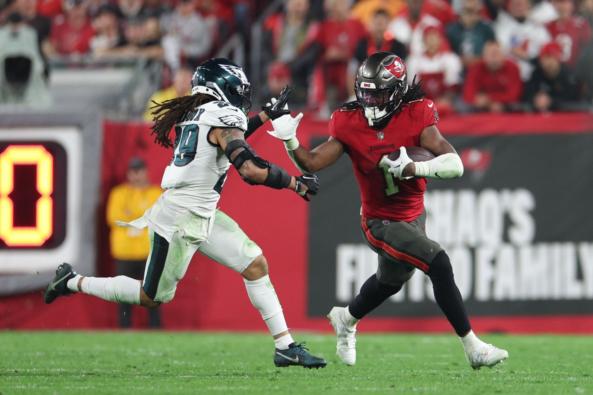 Jan 15, 2024; Tampa, Florida, USA; Tampa Bay Buccaneers running back Rachaad White (1) fends off Philadelphia Eagles cornerback Avonte Maddox (29) during the second half of a 2024 NFC wild card game at Raymond James Stadium. Mandatory Credit: Nathan Ray Seebeck-USA TODAY Sports
