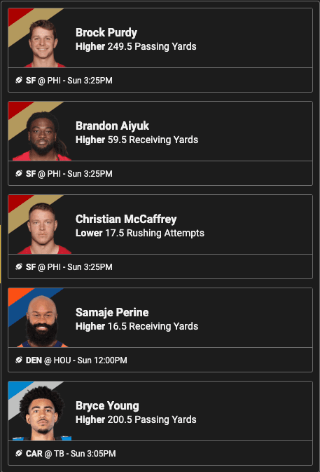 Ultimately, I like using Aiyuk’s HIGHER over Kittle’s or Samuel’s for a few reasons, but mainly because a big day for Aiyuk this year has often meant triple figures in yardage (he’s gone over 100 yards four times). And if we get that kind of result here, it would almost certainly mean our Purdy HIGHER is cashing alongside it.