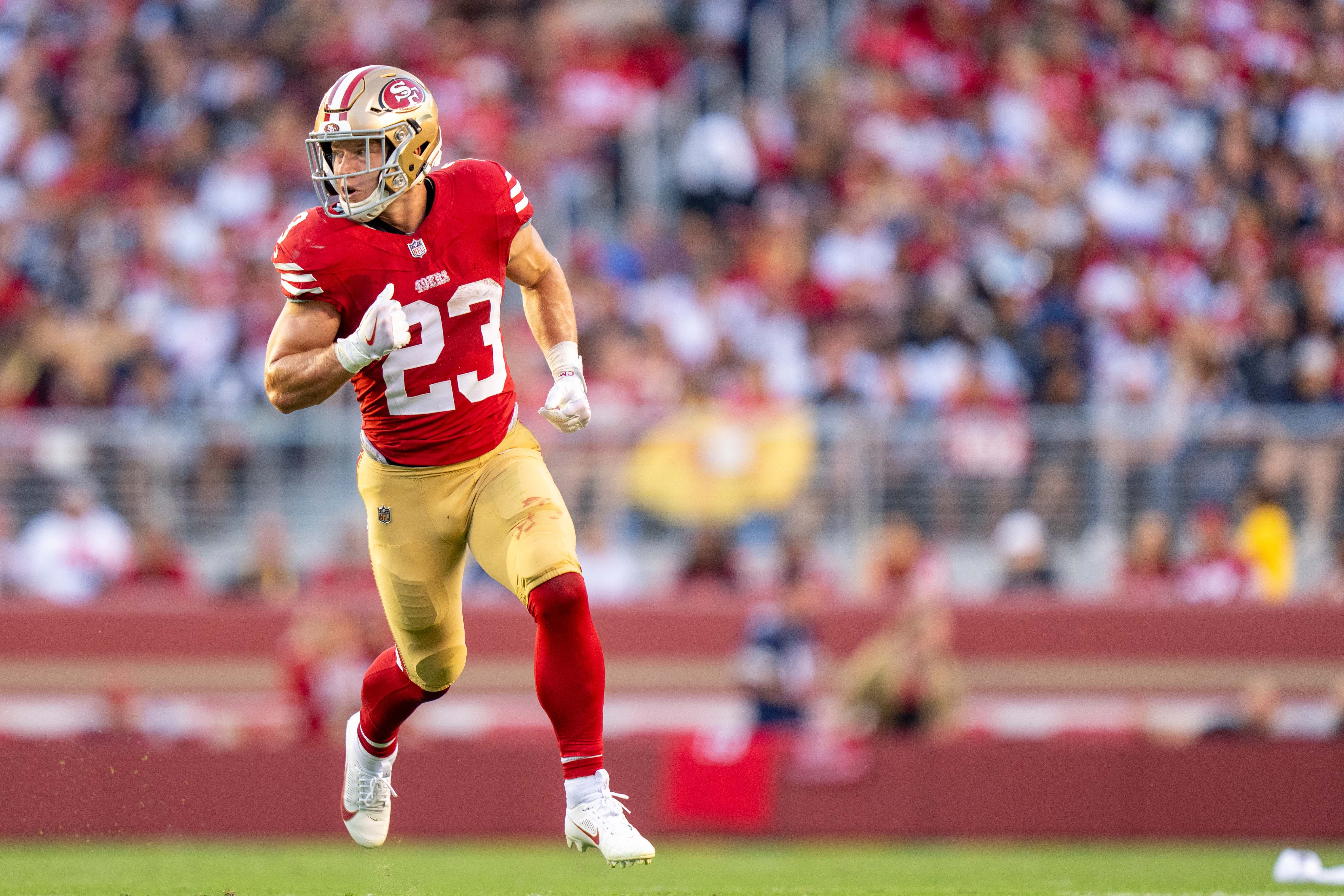 October 8, 2023; Santa Clara, California, USA; San Francisco 49ers running back Christian McCaffrey (23) during the first quarter against the Dallas Cowboys at Levi's Stadium. Mandatory Credit: Kyle Terada-USA TODAY Sports