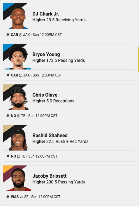 Rather than pair Olave with a HIGHER on Derek Carr’s passing yards (and lower our payouts even more) the more prudent move to me is simply to target the HIGHER on Olave’s running mate, Rashid Shaheed, whose rush/rec yards total is set at an embarrassingly low 32.5 yards (as of writing).