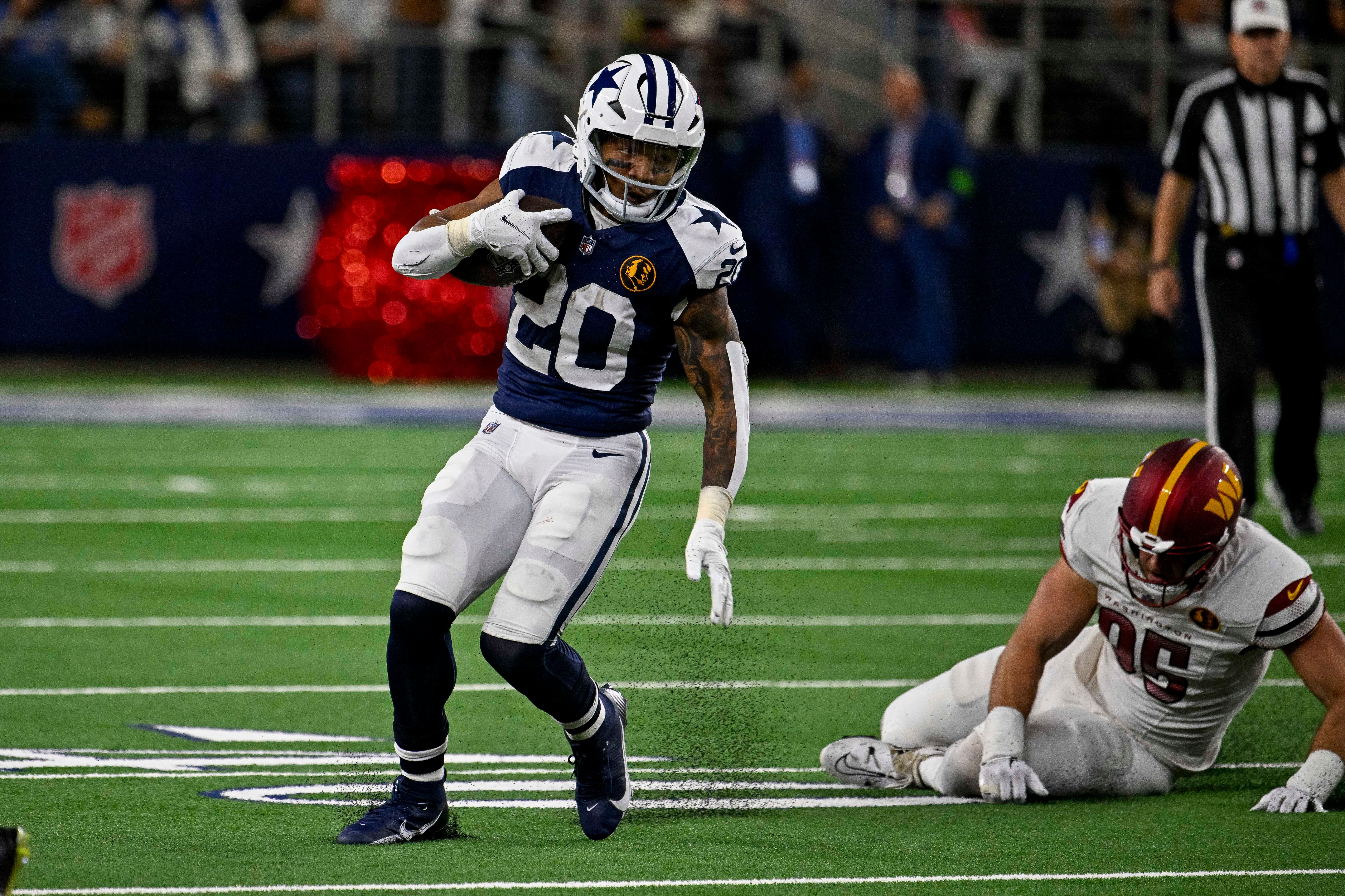 Nov 23, 2023; Arlington, Texas, USA; Dallas Cowboys running back Tony Pollard (20) in action during the game between the Dallas Cowboys and the Washington Commanders at AT&T Stadium. Mandatory Credit: Jerome Miron-USA TODAY Sports