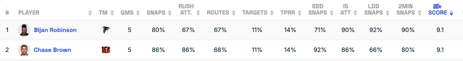 Since Week 12, Bijan has the best Utilization Score among all RBs along with Chase Brown: