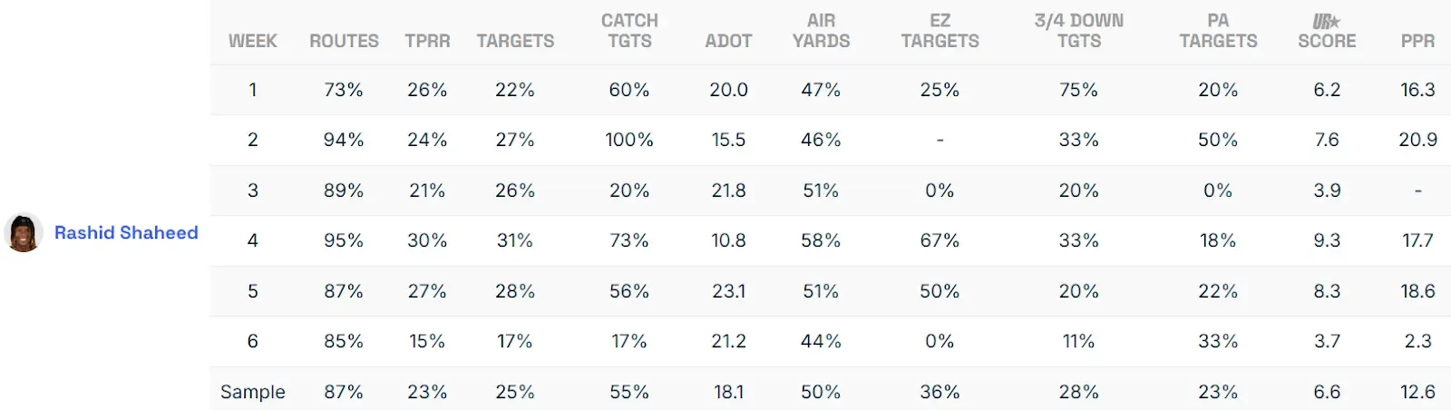 In his first three seasons in the NFL, Shaheed has been a bit of a deep ball merchant, but he was actually earning targets at a good clip to open this season before a knee injury cost him all but six games.