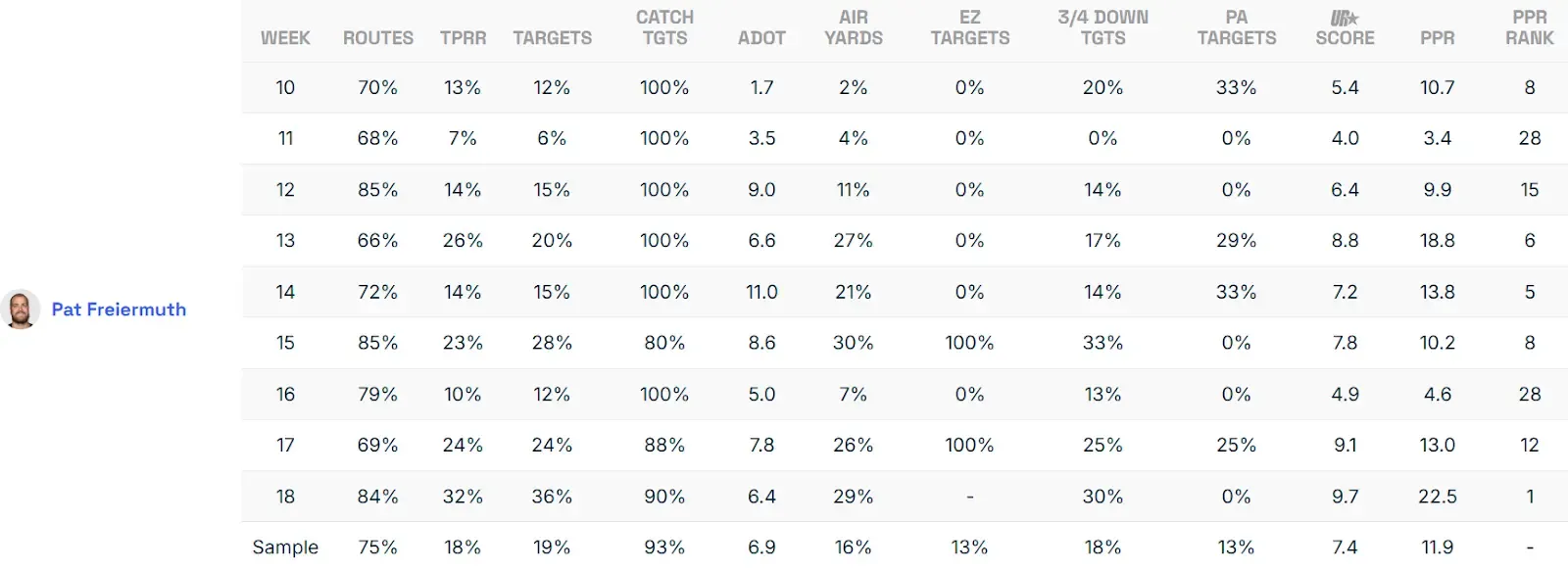 As a rookie, Freiermuth scored seven TDs. As a sophomore, he finished as the TE8 thanks to almost 100 targets, 60+ receptions, and 700+ receiving yards. He fell off in Year 3 as he only played in 12 games but he vaulted back into the top-10 at the position last year thanks to a strong second half of the season following a Week 9 bye.