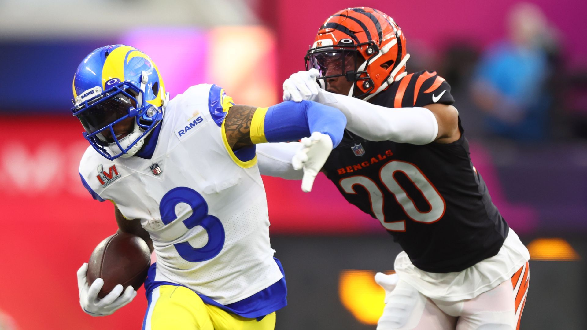 Feb 13, 2022; Inglewood, CA, USA; Los Angeles Rams wide receiver Odell Beckham Jr. (3) runs the ball against Cincinnati Bengals cornerback Eli Apple (20) during the second quarter in Super Bowl LVI at SoFi Stadium. Mandatory Credit: Mark J. Rebilas-USA TODAY Sports