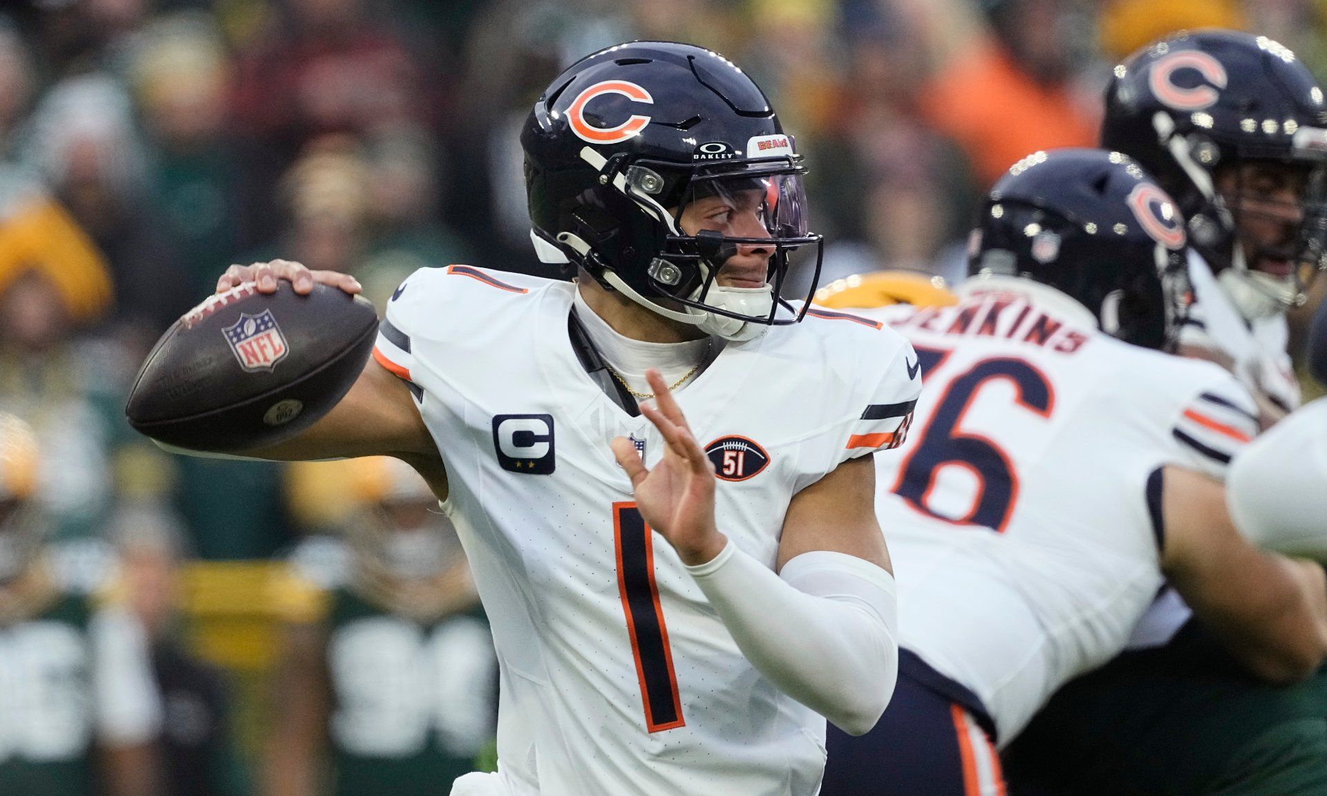 Jan 7, 2024; Green Bay, Wisconsin, USA; Chicago Bears quarterback Justin Fields (1) throws a pass during the first quarter against the Green Bay Packers at Lambeau Field. Mandatory Credit: Jeff Hanisch-USA TODAY Sports