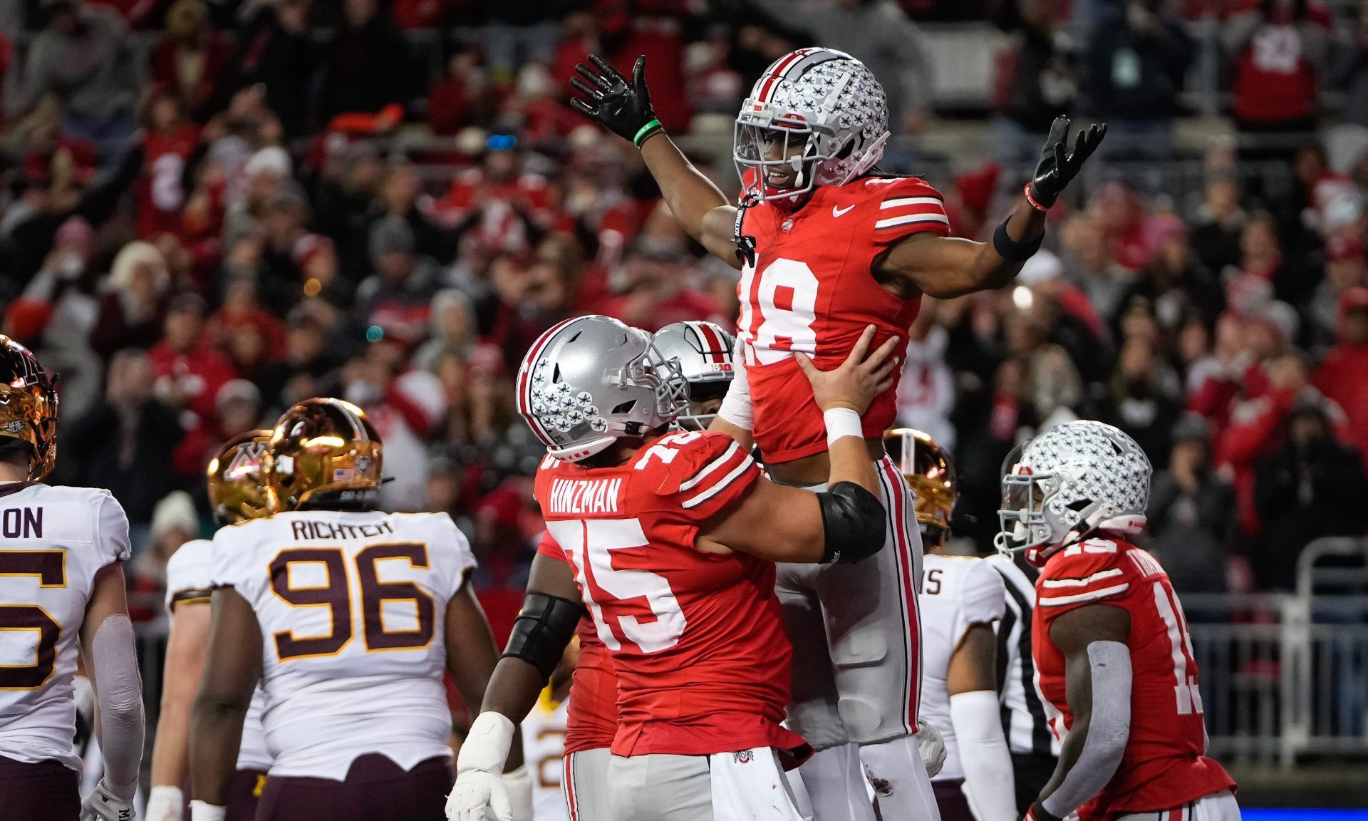 Nov 18, 2023; Columbus, Ohio, USA; Ohio State Buckeyes offensive lineman Carson Hinzman (75) hoists wide receiver Marvin Harrison Jr. (18) after the latter scored a touchdown during the second half of the NCAA football game against the Minnesota Golden Gophers at Ohio Stadium. Ohio State won 37-3.