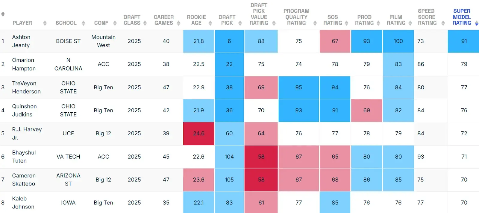 In the history of the model (2018-2025), both Hunter (No. 5) and McMillan (No. 7) crack the top 10. That's pretty impressive given the players on the list.