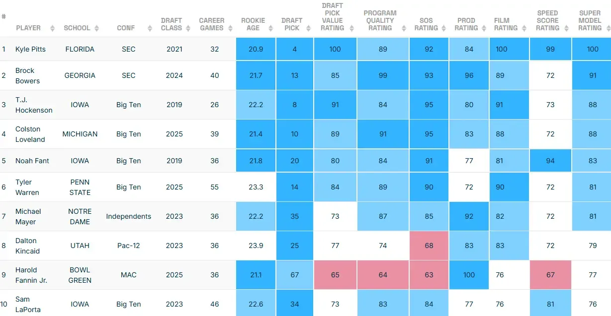 To put in perspective just how special the top of this TE class has the potential to be, both Loveland and Tyler Warren represent two of the top-six spots in our Rookie TE Model from 2018-2025.