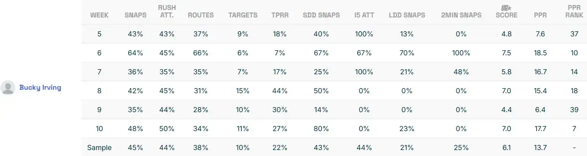 During Tampa's Week 11 bye, Jonathan Fuller tabbed Irving as a fantasy football trade target with league-winning upside. He highlighted how Irving was clearly the superior rusher, but also wasn't far behind Rachaad White as a pass catcher. Finally, he cited the rest-of-season schedule for the Bucs and how, even if the current split remained the same, Irving still offered immense upside.
