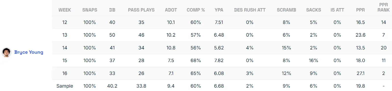 So far, that thought process has proven to be mostly true. Since his Week 11 bye, Young has been a solid fantasy asset, averaging almost 20 points per game.