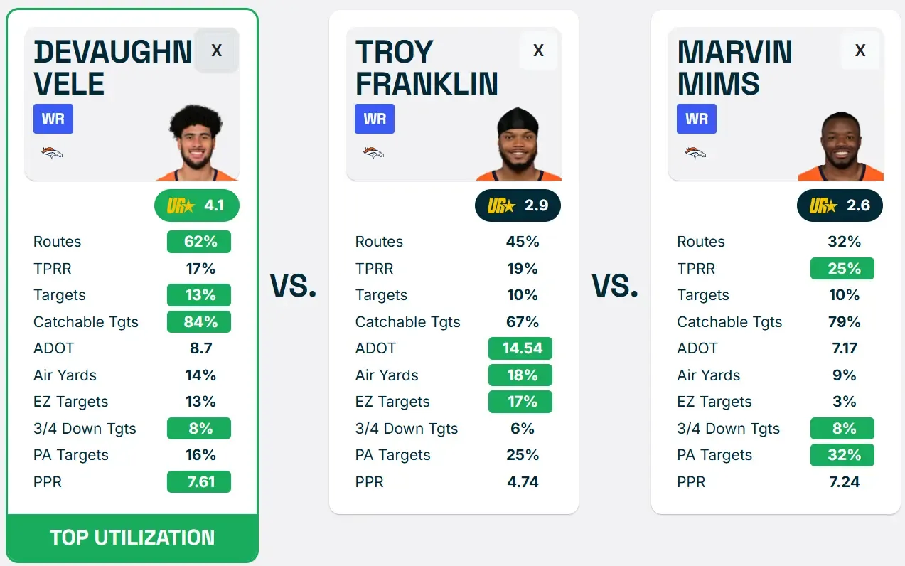 Each of them had between 52-55 targets, but I'm most interested in Franklin's aDOT (14.54) and air yards share (18%). If he can get those route participation and target share numbers up in Year 2, there's a strong chance that Franklin becomes a viable option for your fantasy teams