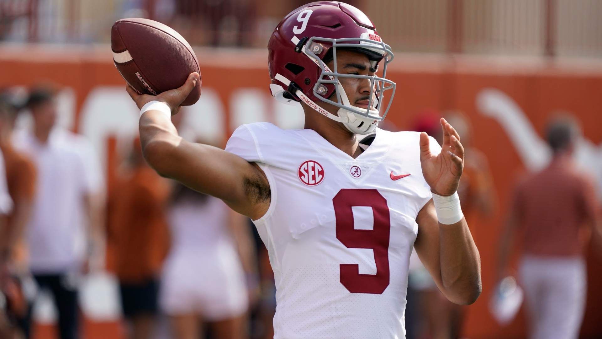 Sep 10, 2022; Austin, Texas, USA; Alabama Crimson Tide quarterback Bryce Young (9) warms up before the game against the Texas Longhorns during the first half at at Darrell K Royal-Texas Memorial Stadium. Mandatory Credit: Scott Wachter-USA TODAY Sports