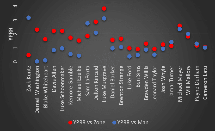 In a packed TE class, Washington’s inability to separate from his teammates makes breaking away from his peers hard. And actually, he even had a tough time separating from defenders. His YPRR split against man and zone coverage was the second-highest in the class.