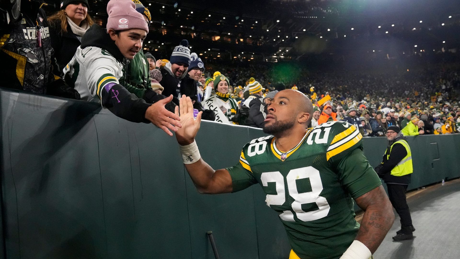 Green Bay Packers running back AJ Dillon (28) high-five fans after their 31-28 overtime win against the Dallas Cowboys on Sunday, Nov. 13, 2022 at Lambeau Field in Green Bay. Packers Cowboys Packers14 4139